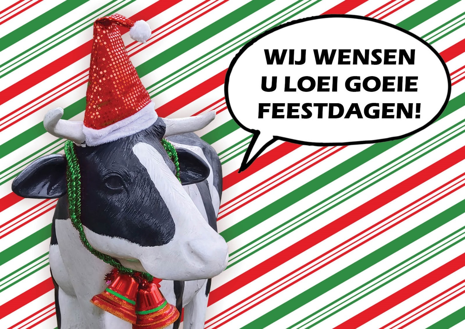 Op de kaart prijkt de kop van een koe die loeit: Wij wensen u loei goeie feestdagen. De koe is een knipoog naar de drie koeienbeelden die langs de Nieuwe Boezemstraat staan. De bewonersgroep liet deze beelden in 2011, met hulp van de voorganger van Havensteder, neerzetten met de letters: Welkom in Crooswijk. De letters worden binnenkort vernieuwd in samenwerking met Havensteder en houtbedrijf Slagplug. En ieder jaar zorgt de bewonersgroep voor mooie versiering in de winter. Vanaf 12 december 2024 gaan de lichtjes bij de koeien aan! Hulde aan deze groep bewoners die zich zo inzet voor een mooi en gezellig Crooswijk.