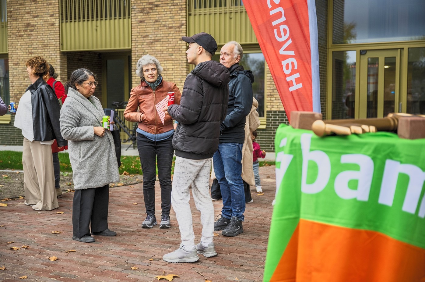 Bewoners krijgen veel woonplezier toegewenst door Wouter Kroes, manager Buurten&Wijken Havensteder (linksachter), Chris Warbout, manager Vastgoedontwikkeling Havensteder (helemaal rechts), en links daarnaast: Jaap Jan Smit, commercieel directeur Zuidwest BAM Wonen.