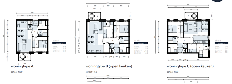Er zijn in totaal 5 type appartementen. Het zijn 3 soorten appartementen waarbij woningtype B en C een keuze is tussen een open of een gesloten keuken.