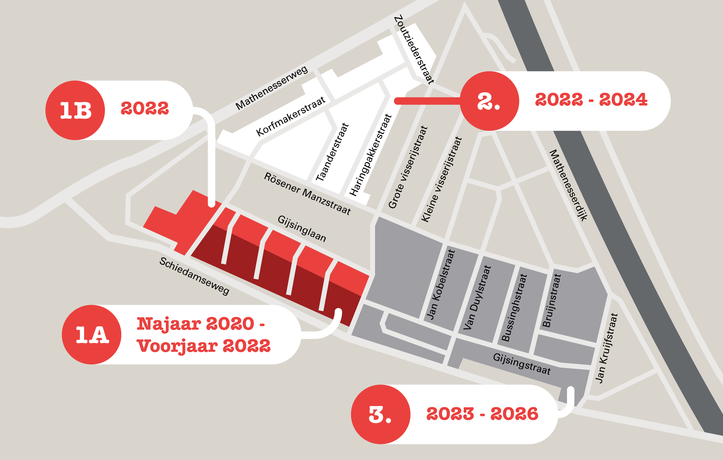 Voor het eerste deel van Bospolder-Tussendijken is het plan klaar. De woningen liggen in het gebied rond de Gijsinglaan, Korfmakersbuurt en Professor Oud-buurt. Havensteder sluit in dit deel 1.300 huurwoningen aan op een warmtenet. De gemeente sluit 7 panden van de gemeente aan. Het aansluiten gebeurt in fases. Eneco legt stap voor stap het warmtenet aan. En Havensteder bereidt ondertussen de huizen voor. Op de kaart hieronder ziet u wanneer welke straten aan de beurt zijn.